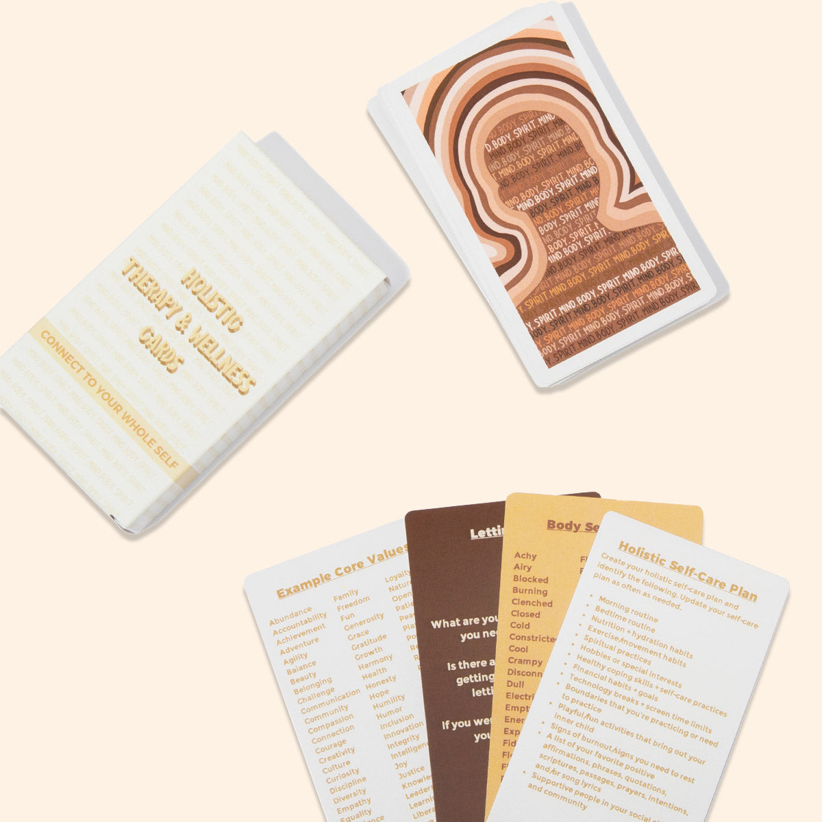Discover our one-of-a-kind therapy card deck filled with 150+ holistic wellness tips, coping skills, therapy-style activities, and self-reflection questions.